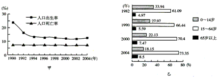 5、单选题 读“某省人口出生率、死亡率变化图”(图甲)和“人口年龄结构变化图”(图乙)。