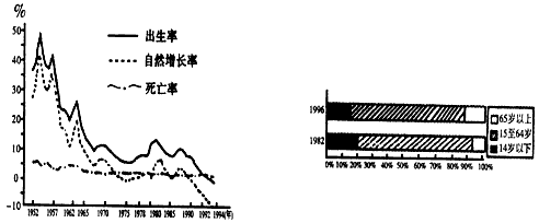 1、综合题 ? 读“上海市人口出生率、死亡率及自然增长率图""(下左图)和“1982年与1996年上海市人口年龄构成比较图”(下右图),回答下列问题。