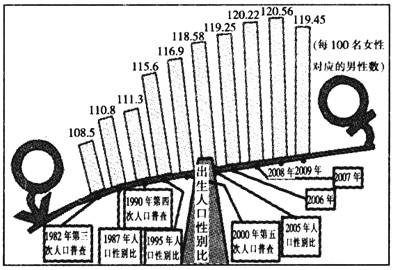 3、单选题 出生人口性别比是全国第六次人口普查工作中的一项数据,是指该人口某一时期(通常为一年)内出生的男婴总数与女婴总数的比值,用每百名出生女婴数相对应的出生男婴数表示(正常值为105±2)。读我国近期出生人口性别比示意图,回答1~2题。