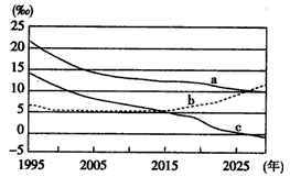 3、单选题 下图是我国人口增长走势及预测图,图中三条曲线表示出生率、死亡率、自然增长率。读图,回答1—2题。