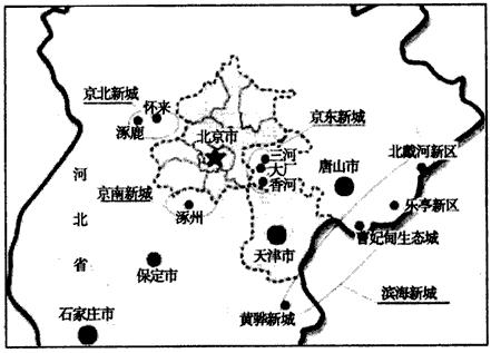 (4)说明北京兴建京北、京东、京南三个新城,对缓解北京城市化过程中产生的问题所起的作用。