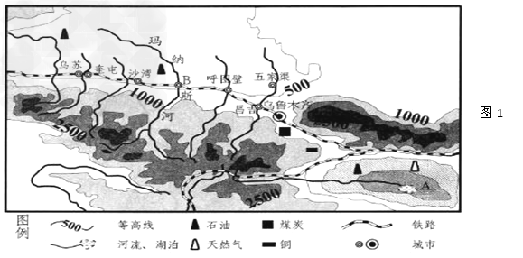 5、综合题 2011年7月,《新疆天山北坡经济区规划》上报至国家发改委,《规划》中该经济区划定的范围是:位于第二亚欧大陆桥通道的西端,包括天山以北、准噶尔盆地南缘的带状区域以及伊犁河谷部分地区。读下列材料,回答问题。