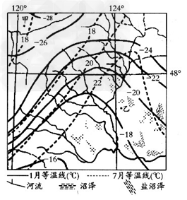 (1)描述图中1月份等温线的大致走向,并分析甲地冬季气温比乙地低的原因。