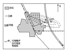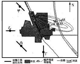 1、单选题 下图为我国华北平原某城市的噪声强度(单位:分贝)等值线分布图,图中黑色圆点代表交通运输网中的点。读图,完成1—3题。