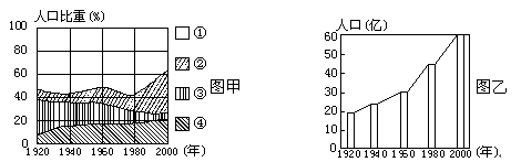 1、单选题 下面图甲是“发达国家和发展中国家城乡人口比重的变化情况图”,图乙是“世界人口增长情况图”。