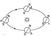 1、单选题 读二分二至日时地球的位置图,回答问题。