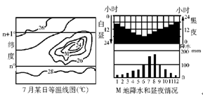 1、填空题 读图(某地区某日平均气温分布和M地全年降水和昼夜情况示意图)完成23-24题。