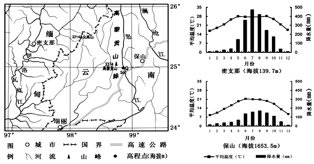 2、单选题 高黎贡山脉两侧自然景观差异显著。图为高黎贡山脉南段两侧部分区域略图,本区域山地冰川的雪线海拔高度在4 800 m左右,以及中密支那和保山的气候统计图。