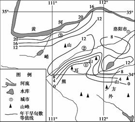 3、单选题 图为豫西部分地区多年平均年干旱旬数分布图。一旬为10天,多年平均年干旱旬数与降水密切相关。完成第27—28题。