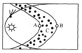本题解析:A星与地球公转方向相同,小行星带位于A与B之间,A靠太阳近是火星,B是木星,九大行星绕日公转时有同向性、近圆性和共面性。