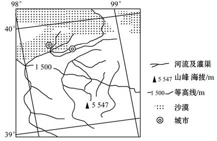 1.根据图中经纬网98?E到99?E,40?N附近,为我国西北地区,再结合图例,该地沙漠广布,多内流河,可知降水较少,因此农业发展的制约的主要因素应是水源。