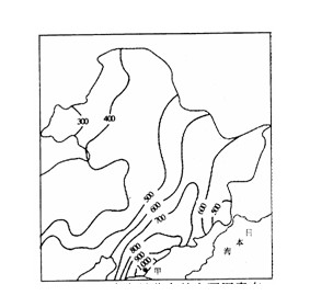4、单选题  读东北地区年降水量分布图(单位:mm),完成1—2题。