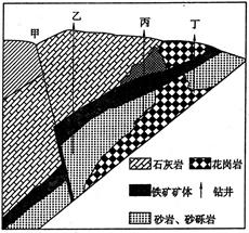 B.丙处钻井可能发现变质岩