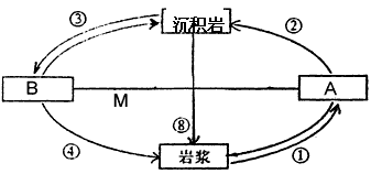 4、综合题 读“三大类岩石转化循环示意图”,完成下列要求。