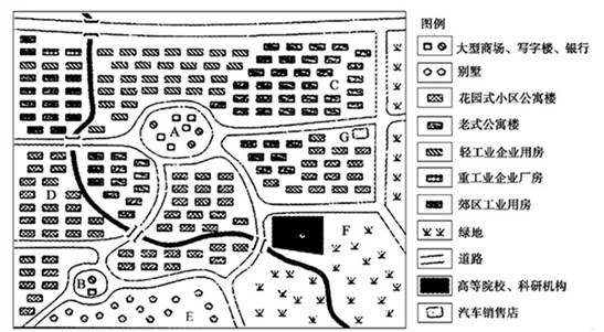 点评:本题难度适中。要求学生熟练掌握中心商务区和低级住宅区的分布及原因、高新技术产业园分布原则、城市空间结构形成的主要因素。