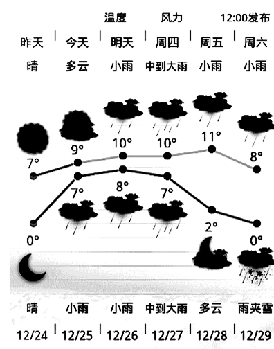 3、单选题  下图为手机软件显示的某地天气趋势图。图中数据分别表示当日最高和最低气温(单位:℃) ,下方的数据表示日期(如12/24为12月24日) 。读图完成下列小题。