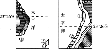 小题1:本题考查影响气候的主要因素。根据图示:①位于南美洲西海岸,为热带沙漠气候,终年受副热带高压带和信风带控制,形成热带沙漠气候,受沿海寒流影响,向北延伸,受地形影响,分布在西海岸狭长区域。与气压带的季节移动无关。所以本题选择D选项。