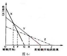 小题3:Z可以布局在城市外围,运费对其影响较小。所以单位距离运费最低,随距离城镇距离增长收益递减最快的是X,在城市外围Z收益较大。所以本题选择A选项。