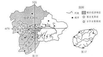 2、综合题 (12分)图16是我国新疆及周边部分国家简图,图17是海南岛主要城市及水系分布图。读图回答问题。