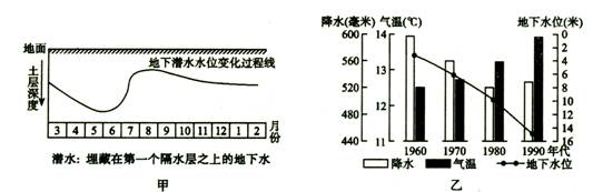 1、单选题 下图中,甲图是我国某平原地区地下水位年内变化示意图,乙图是该地区不同年代地下水位与年均气温、年降水量关系示意图。读图,回答下列各题。