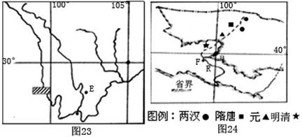 (2)图23和图24中均有我国重要的航天发射基地,其中图23中的E地是________,图乙中的F地是________,现准备发射一颗大吨位,小倾角的人造卫星,从理论上看,应选择在________(填字母)发射较好,请简要说明理由。