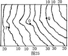 ”绘出图23阴影地区所示河流的干流。根据有关资料显示,图25中等温线所示季节O地的降水往往比附近的P和Q地少很多,请简要分析原因。