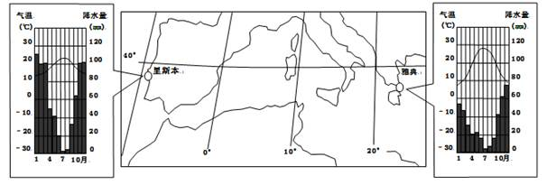 1.两地的夏季温度有差异,其主要原因是里斯本2.两地的年降水量有差异,其主要原因是雅典