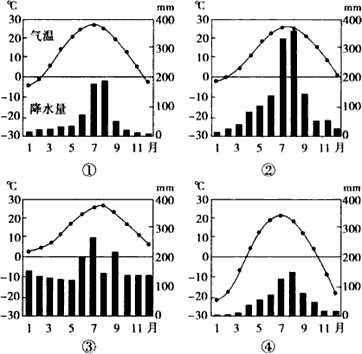 (3)下列四幅气候特征图中分别表示北京和松江的是哪两幅?试比较两个城市的气候特征的差异,并简