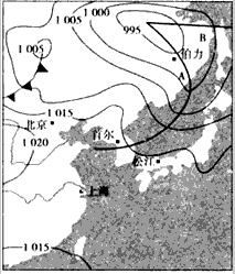 1、综合题 ? 下图为东亚部分地区地理简图,图中等值线表示某年11月2日15时(北京时间)东亚地区海平面气压分布状况,黑色粗曲线表示锋面。读图回答下列问题。