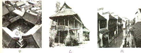1、综合题 中国疆域辽阔,民族众多,各地的地理气候条件和生活方式都不相同,因此,各地人民居住的房屋的样式和风格也不相同。读下列我国不同地区的传统民居建筑图,运用地域文化与环境关系的有关原理,回答问题:(9分)