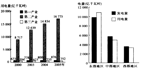1、综合题 下图左为“2000—2005年我国三大产业用电量柱状图”,右为“2003年我国东、中、西部发电量和用电量柱状图”。读图回答下列问题。