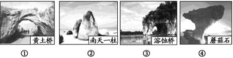 【小题1】黄土桥是黄土高原流水侵蚀作用形成的;南天一柱是海水侵蚀地貌;溶蚀桥是石灰岩分布地区流水溶蚀作用而成;蘑菇石是风力侵蚀作用形成的,故C项正确。