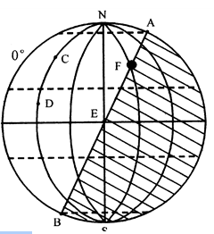 (1)阴影部分表示黑夜,非阴影表示白天,在图上标出太阳直射点。