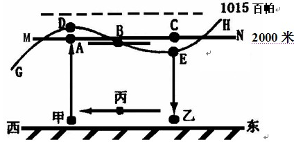 【小题3】在近地面,甲处气压比乙处低,丙处实际风向是刮东南风。