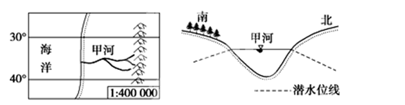 【小题2】从右图中可以看出,此时河流水位高于潜水位,河流水补给潜水,为丰水期,降水较多;因此此时为南半球的冬季,该地受盛行西风带控制,盛行西北风。