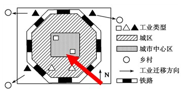 小题1:从图中不难看出,▲工业由城市外缘向乡村迁移,根据对大气有污染的企业应布局在盛行风向的下风向或垂直于主导风向的郊外的布局原则,判断该地的盛行风向为东南风,如下图所示。