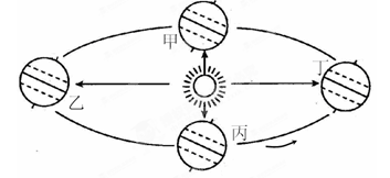 本题解析:本题考查地球运动。材料反映黑龙江漠河昼短夜长,判断为北半球的冬季,则地球运动接近冬至日附近,利用图示的太阳直射点位置判断:乙处太阳直射点位于北回归线上,为夏至日;丁处太阳直射点位于南回归线上,为冬至日。