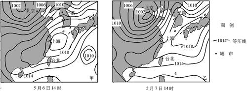 (1)图示5月6日北京地处低气压中心的东南侧,吹东南风;5月7日,北京地处低气压中心的北侧,吹东北风;且从5月6日到5月7日,影响北京地区的等压线变密,水平气压梯度变大,风力变强。