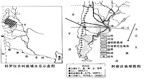 材料一、左图为阿根廷地理简图,右图为左图中方框区域的放大图。