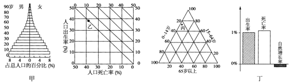5、单选题 读“甲、乙、丙、丁四地的近年人口统计图”,回答问题。(图乙百分号改为是千分号)