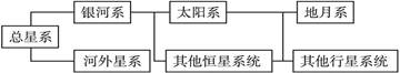 1.天体之间相互吸引、相互绕转,构成不同级别的天体系统。我们目前认识的宇宙的范围为总星系。如下图所示: