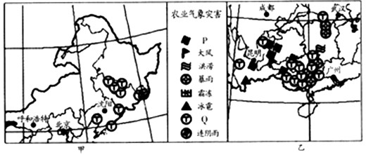 3、单选题 读下图(2010年4月下旬我国部分地区农业气象灾害分布图),回答1~3题。