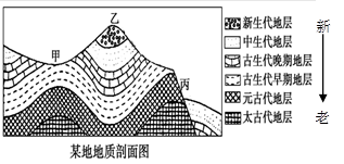 (3)地质剖面图上,甲、乙、丙三处的地质构造为向斜的是 处;如果在该地区进行钻井,有可能在 地找到石油、天然气。(4分)