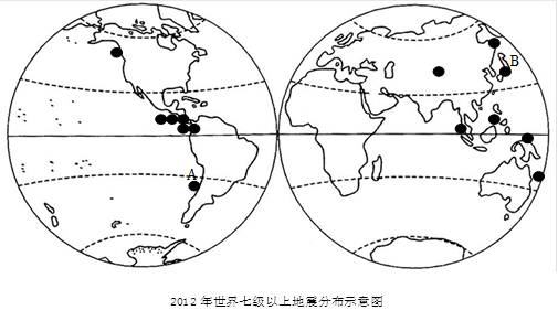 2、综合题 (10分)读“2012年世界七级以上地震分布示意图” 与“某地地质剖面图”,分析回答下列问题。