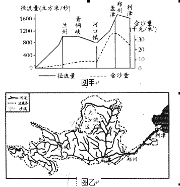 图甲为黄河干流径流量和含沙量变化示意图,图乙为黄河流域图。