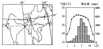 小题1:图示右图反映的气候类型为热带季风气候。左图中甲位于印度河流域为热带沙漠气候;乙位于雅鲁藏布江谷地,为亚热带季风气候;丙位于恒河下游,为热带季风气候;丁位于我国长江流域,为亚热带季风气候。