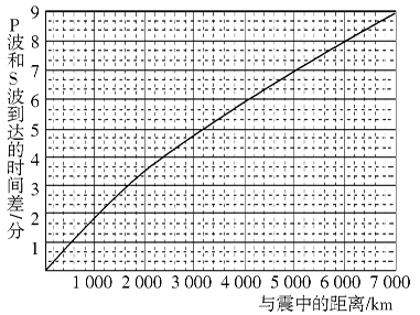 材料二 P波和S波到达的时间差与震中到地震台之间距离的关系。