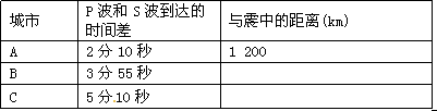 (1)根据材料二和下表中P波、S波到达三城市的时间差,完成下表。(4分)