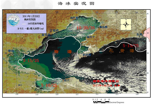 3、综合题 结合2011年2月中旬渤海及黄海北部海冰预报图,回答问题。