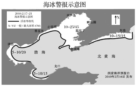 3、单选题 2010年新年以来,渤海和黄海北部出现30年来最严重海冰冰情,下图为我国海洋局发布的2010年2月17日-21日海冰警报示意图(图中白色区域为海冰覆盖区),读图回答1—2题。